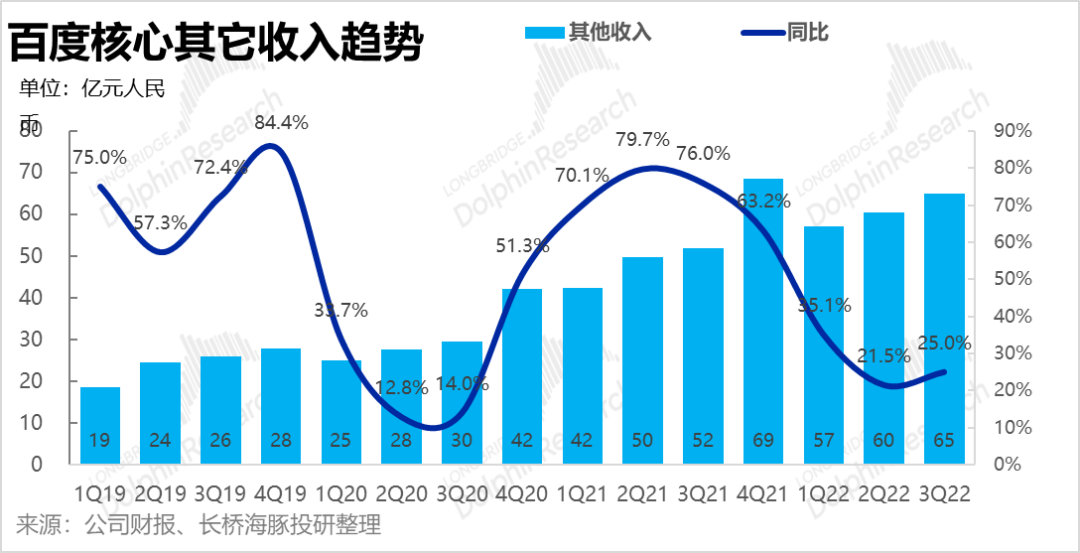 三季度百度核心其他收入约在65 亿,同比增长接近 25%,也就是比疫情集中二季度的22%稍微改善了一点,这个改善主要是由于非云业务带来的。