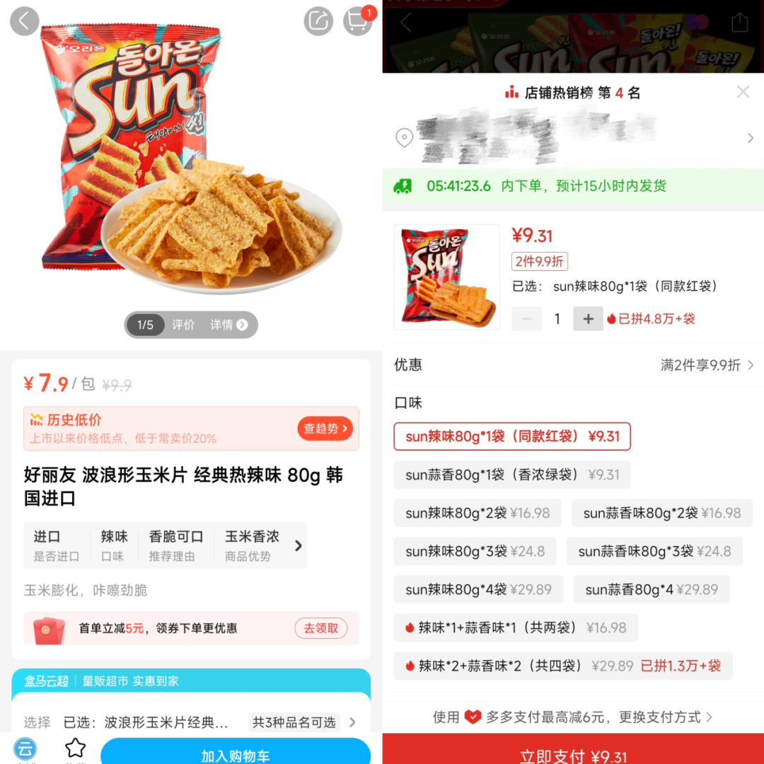 在价格方面,盒马App的部分商品,比拼多多还要便宜。比如,韩国进口的好丽友波浪形玉米片,一包重量为80克,盒马App售价7.9元;拼多多上的同款商品,售价为9.31元,比盒马贵了1.41元。