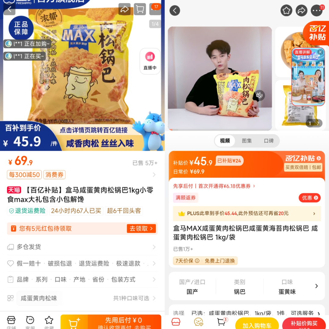 比如,作为盒马的代购顶流,盒马MAX咸蛋黄海苔肉松锅巴,在淘宝和京东上,均是原价69.9元、补贴价45.9元,比官方App贵了9.18元。
