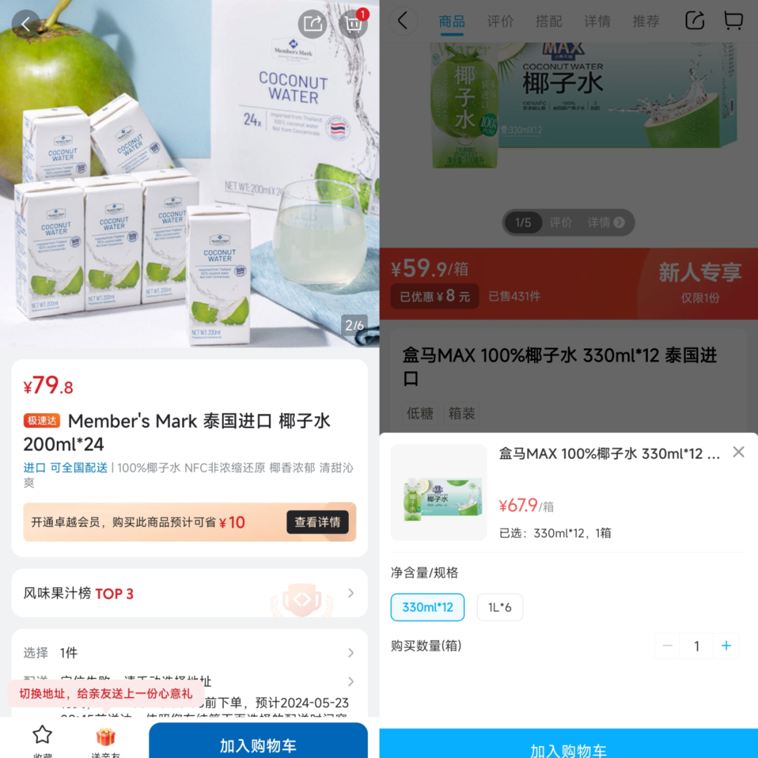 比如,同样是椰子水类产品,盒马MAX100%椰子水,330毫升共12瓶,售价67.9元;山姆的自营椰子水,200毫升共24瓶,售价79.8元。按照单位净含量计算的话,价格比盒马还便宜。