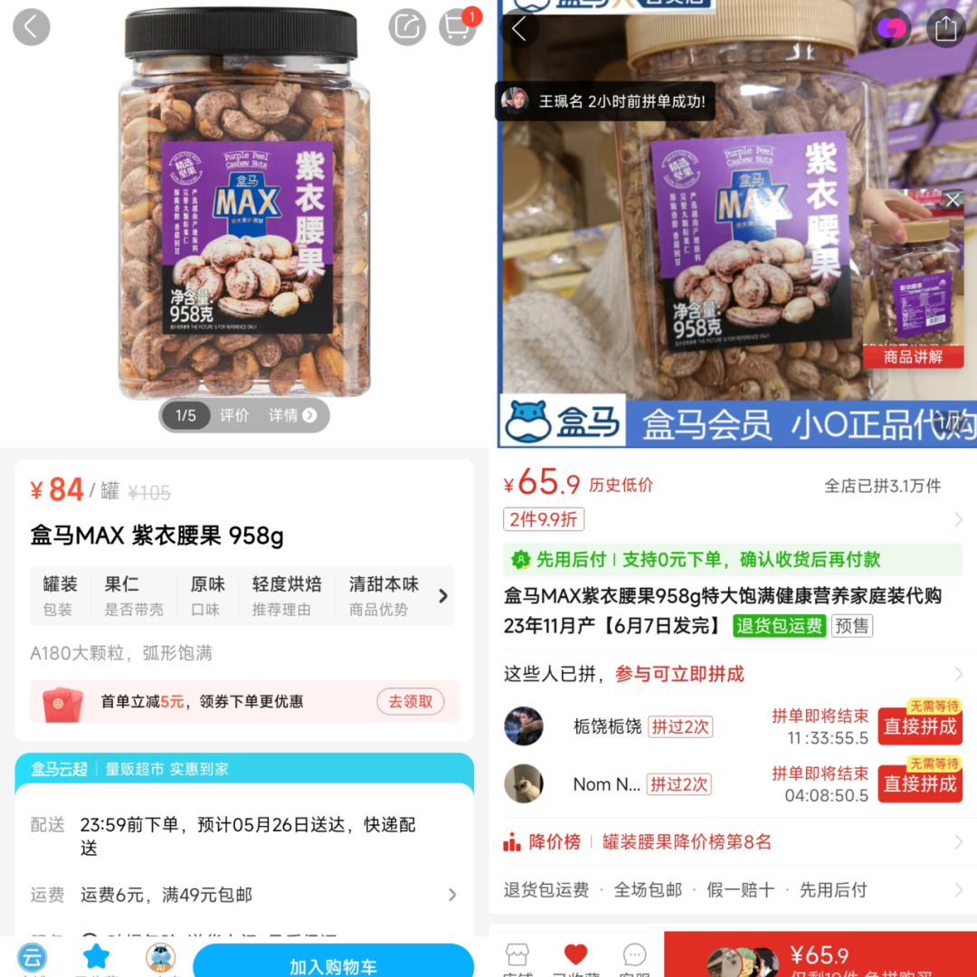 另一边,盒马MAX紫衣腰果,重量为958克,官方App售价84元,拼多多同款售价65.9元,比官方便宜了18.1元。