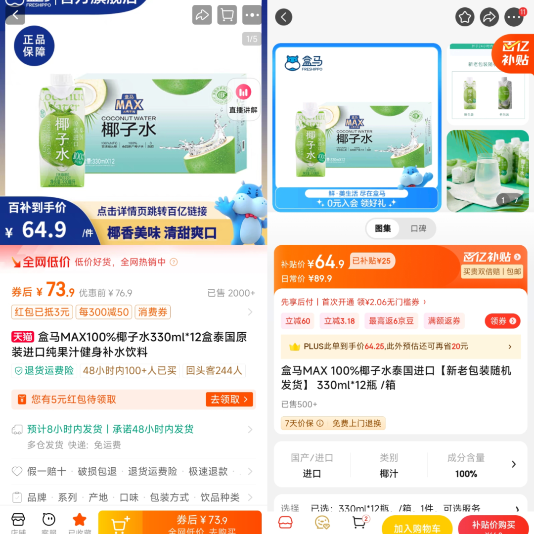比如,盒马MAX100%椰子水,淘宝售价76.9元、百补价64.9元;京东日常价89.9元、补贴价64.9元,比盒马App的价格,还便宜了3元。