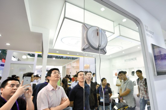 科沃斯推出的窗宝9系擦窗机器人是会场中最灵活的机器人,它像蜘蛛侠一样吸附在玻璃上,上下左右腾挪,引起了参观者的注目。