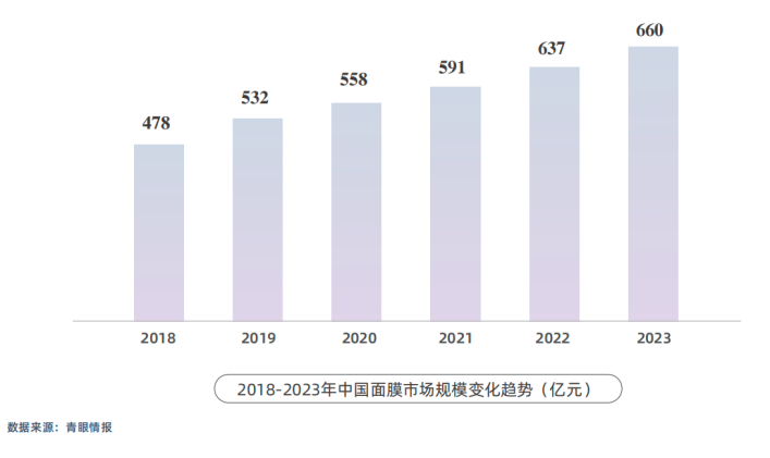 此前,敷尔佳联合美妆行业头部媒体青眼发布的《2024年面膜趋势洞察报告》显示,2023年我国面膜市场规模达到660亿元,占化妆品市场总规模的8.14%,2018-2023年的复合增长率为6.7%;以目前的增速预估,到2025年面膜市场规模有望突破750亿元。