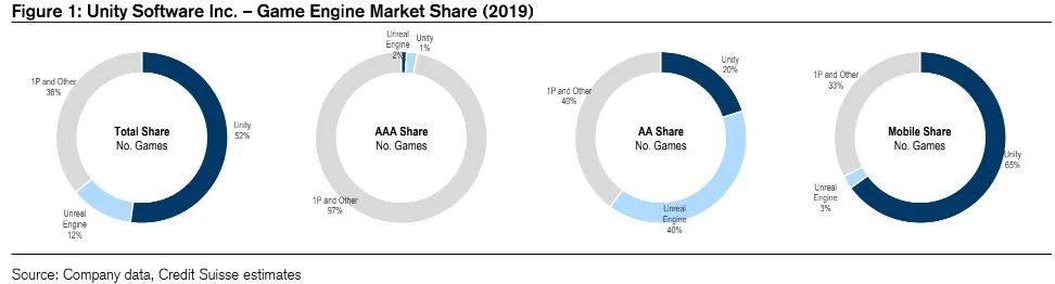 而也有一些人从游戏公司中出来创业,开始做专门服务于没有能力自研引擎的中小游戏厂商的商业引擎。Unity正是其中之一,创立于2004年,于2005年开始在推出适用Mac系统的引擎以实现商业化,到2020年实现游戏引擎领域整体市占率超50%(移动游戏超70%),AR/VR领域市占率超60%的领先地位。Unity靠的不仅仅是赛道的优异,还与自身的战略选择、产品定位以及商业模式息息相关。