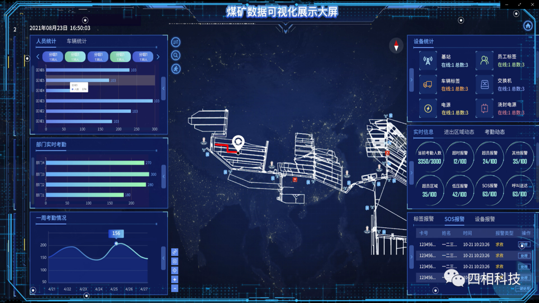 为了确保在恶劣的矿井环境下实现对目标的精确定位,四相科技矿用人员精确定位系统使用UWB+ZigBee组合技术:UWB专注定位,实现煤矿井下30CM内的精准定位;ZigBee专注通信,保证信息传输的稳定。同时该系统使用真实比例的GIS矿图,搭配智慧大屏界面,可实现对煤矿井下数据一体化展示,该界面下实时统计人员车辆信息、人员考勤情况、各类报警情况、设备在线监测等数据,实现矿井下场景的真实还原,人员实时分布一目了然。通过该界面,辅助矿企实现对井下目标要素定位相关数据的整体展现与把控。