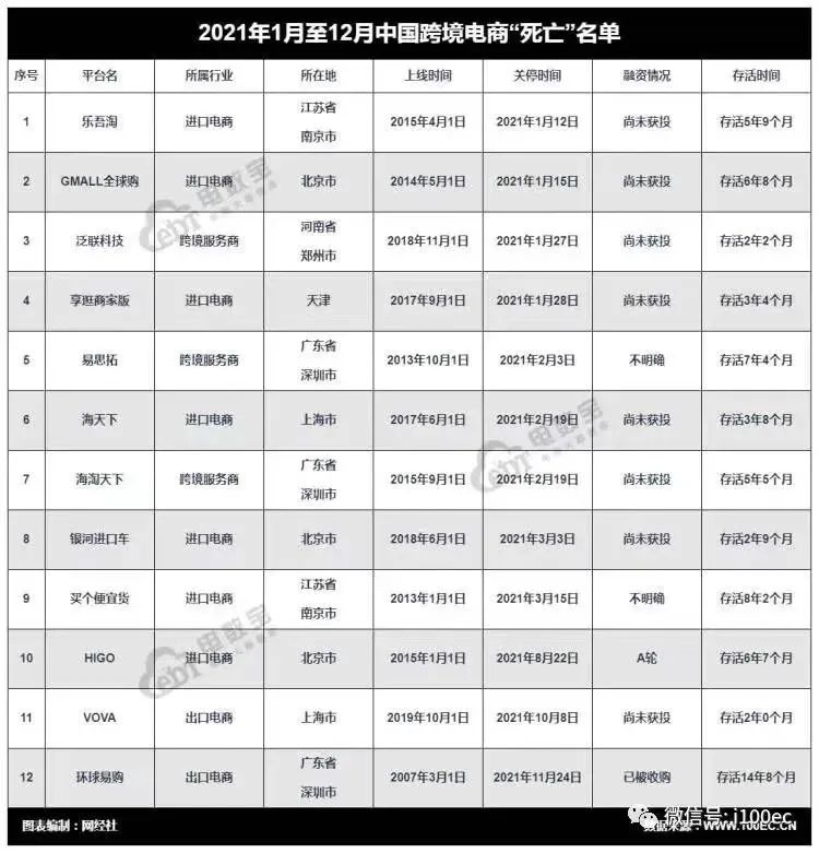 据“电数宝”监测统计,2021年中国跨境电商“死亡”数(该数据库定义的“死亡”包括公司破产、倒闭、重大重组、创始人跑路、平台关停或停更等)多达12家,分别为乐吾淘、GMALL全球购、泛联科技、享逛商家版、易思拓、海天下、海淘天下、银河进口车、买个便宜货、HIGO、VOVA、环球易购。