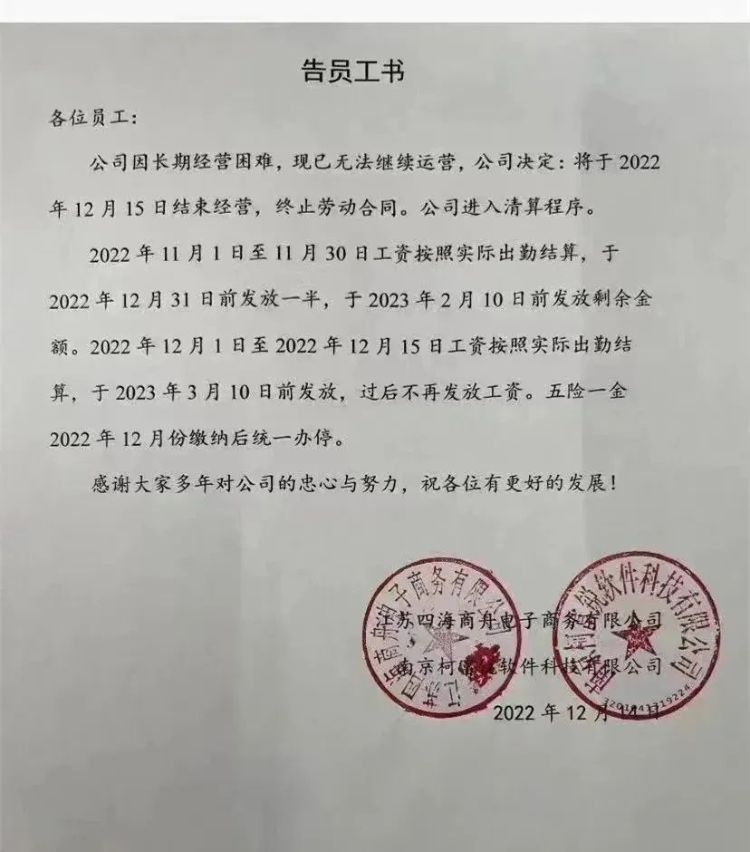 近日,江苏四海商舟电子商务有限公司(下称“四海商舟”)发布的一封告员工书走红网络,公司称因长期经营困难,已无法继续运营,决定于2022年12月15日结束经营,终止劳动合同。公司进入清算程序。