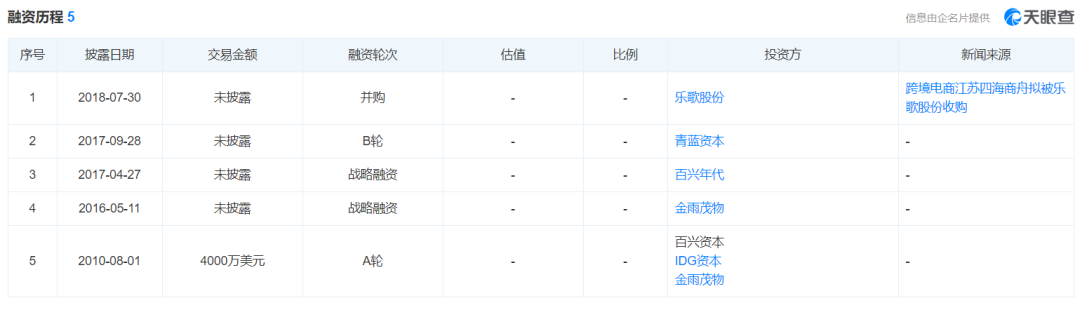 同一时间段,四海商舟再次获得资本追捧。天眼查显示,四海商舟共获得四轮融资,投资方除了IDG还包括青蓝资本、百兴年代和金雨茂物。