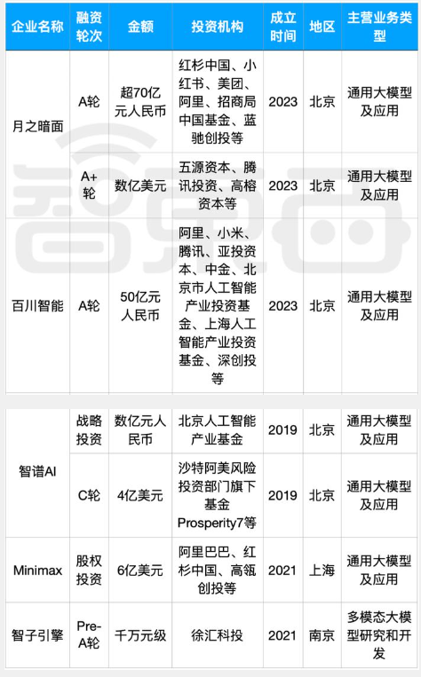 事实上,当我们去盘点上述提及的零一万物、智谱AI、百川智能、月之暗面这四家今年均获得亿元以上融资额的“AI新小龙”企业,会发现,互联网大厂的身影一直未有缺席。