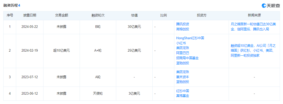查询天眼查APP发现,2024年5月完成B轮融资的月之暗面投资方主要是腾讯、高榕创投。而早先,月之暗面就已经吸引了阿里巴巴、小红书、美团等互联网大厂投入其中。