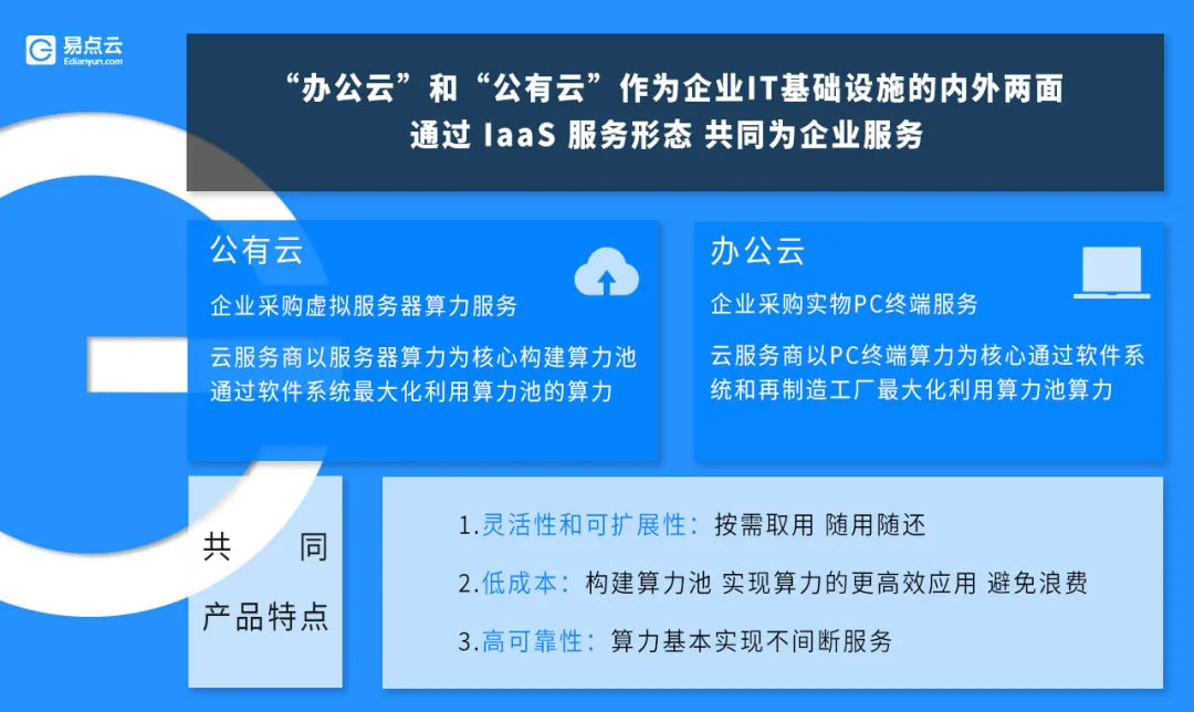 易点云将“办公云”与“公有云”类比,将其描述为:企业采购实物PC终端,云服务商以PC终端算力为核心通过软件系统和再制造工厂最大化利用算力池算力。