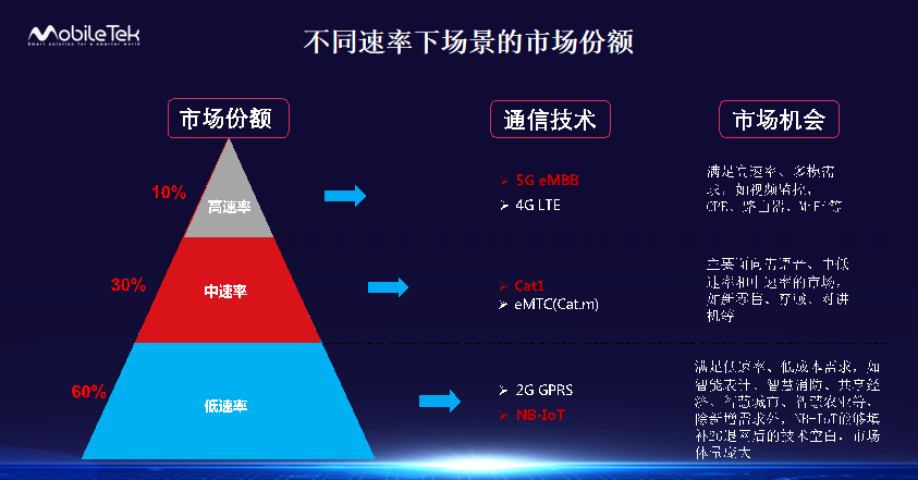 从各种通信技术的市场占比来看,以NB-IoT为代表的低速率通信技术占据了60%的市场份额,满足了低速率、低功耗、低成本的需求,适合常供电的场景使用,如燃气表、水表等智能表计每年的市场需求量十分庞大。