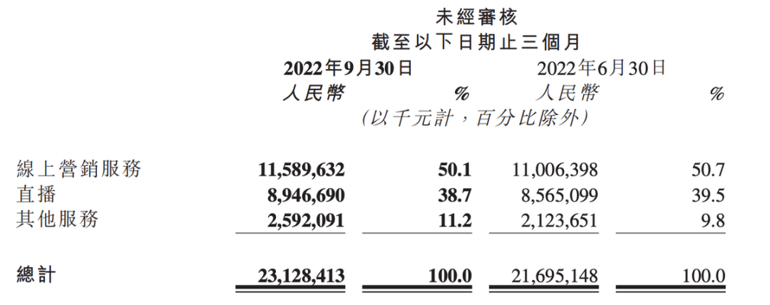 从业务营收来看,为快手贡献主要营收业务,线上营销服务三季度收入同比增长了6.2%,创历史新低;其余两大业务线,直播业务及电商收入则保证了稳定增长。