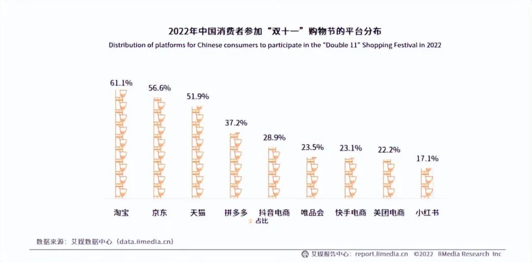 在快手“116购物节”的“购物金”活动中 ,用户可以通过完成任务获取购物金,以减免活动满减的金额。其中有一项任务是直接跳转到辛选主播直播时间表的页面中,引导用户预约直播。但头部主播对于快手品牌化和商业化的牵制和影响,一直存在下沉化的标签亦是。在电商业务上,快手的风头始终不及抖音和淘宝。据艾媒咨询数据显示,2022年中国受访网民参加双十一购物节的平台分布(多选)为,淘宝61.1%、京东56.6%、天猫51.9%、拼多多37.2%、抖音电商28.9%,快手电商占比23.1%。