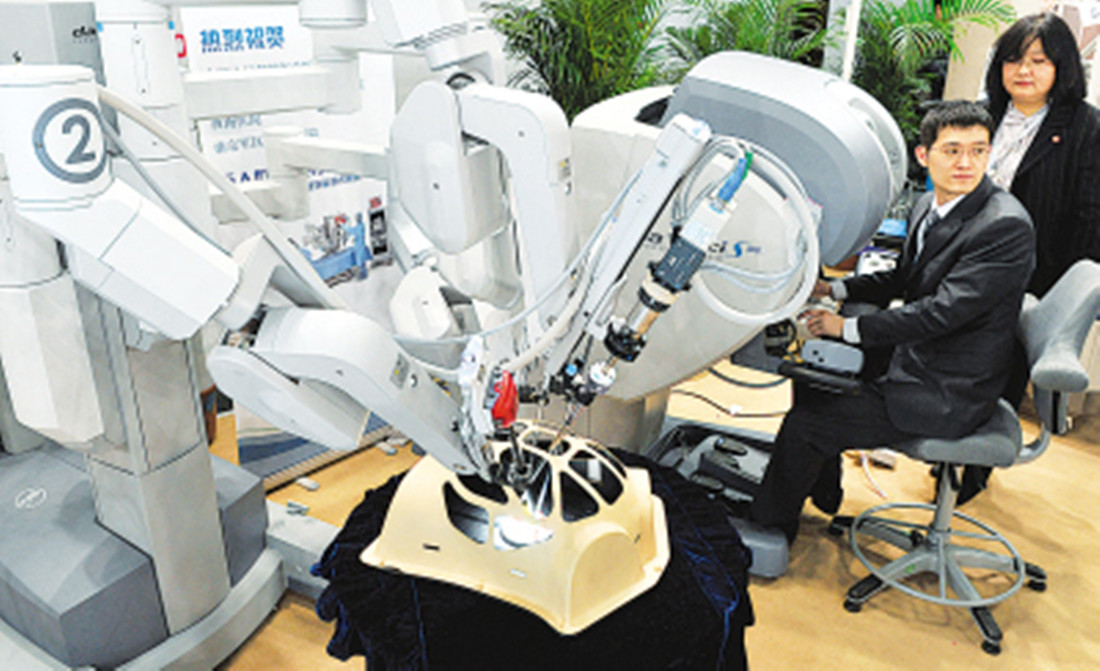 “达芬奇”机器人正在使用机械臂实施手术。它由外科医生控制台、床旁机械臂系统和成像系统三部分组成,能通过计算机系统“过滤”人手抖动,完成超越人手生理极限的动作,将手术创伤最小化。