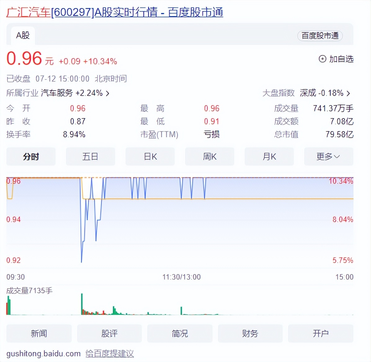 而从2024年6月20日至7月12日,广汇汽车股价已经连续17个交易日低于1元,截至7月12日收盘,广汇汽车股价报0.96元/股,增长10.34%。