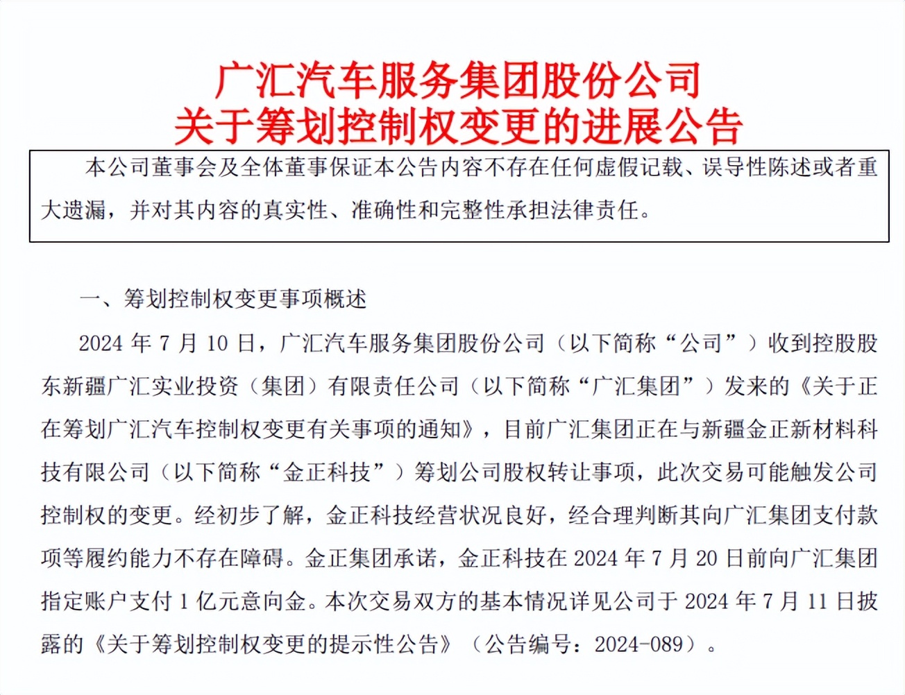 据悉,7月10日,广汇汽车收到控股股东新疆广汇实业投资(集团)有限责任公司(以下简称“广汇集团”)发来的《关于正在筹划广汇汽车控制权变更有关事项的通知》,目前广汇集团正在与新疆金正新材料科技有限公司(以下简称“金正科技”)筹划广汇汽车股权转让事项,此次交易可能触发公司控制权的变更。