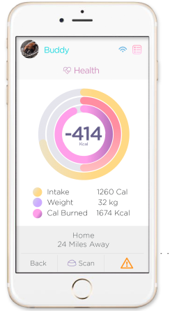 Buddy 通过自带的三维加速器可以为狗狗统计每日步数、睡眠时间及卡路里消耗。宠物主人忘记遛狗怎么办?别着急,通过设置每日运动目标,Buddy 会跟踪狗狗当天活动进展并适时提醒宠物主人,帮助狗狗活泼健康成长。有了充足的运动量还不够,狗狗还需要健康的饮食来补充。Buddy 配套客户端内置二维码扫描功能,并自带由兽医和动物专家提供的最新最受欢迎的宠物食品数据库。通过扫描二维码获取狗狗每日饮食摄取的卡路里,同时与运动数据相抵消,最终得出每日的健康指数。不仅宠物主人可以参考每日健康指数为狗狗适当补给营养品,也可以将其作为狗狗看病的部分参考依据。