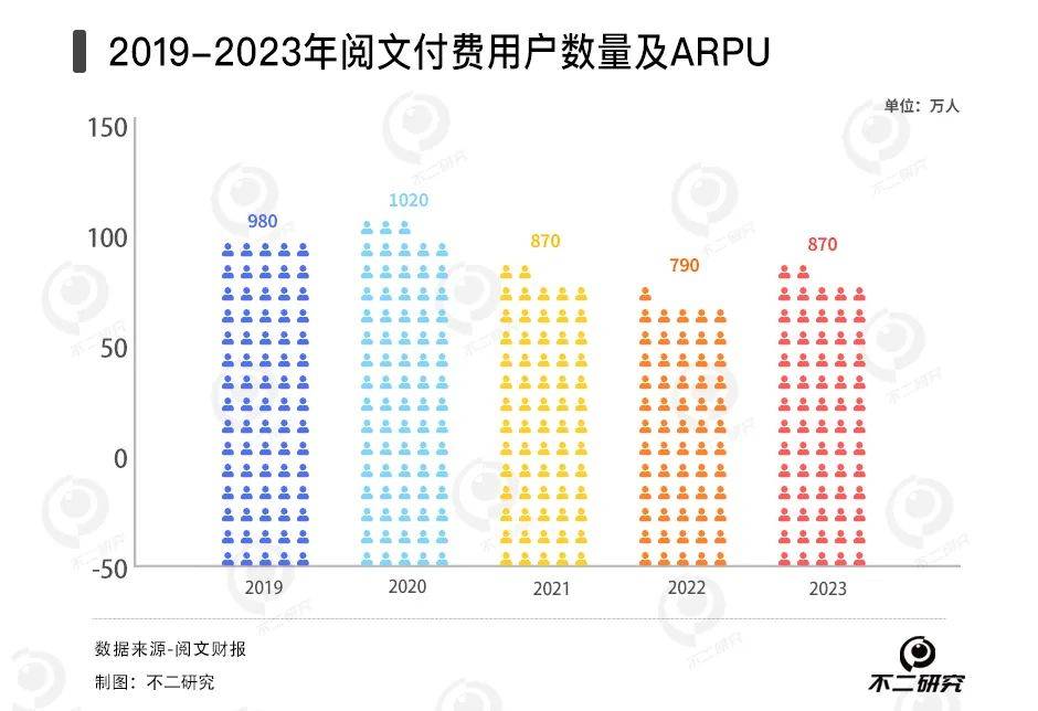 据历年年报数据,2019-2023年,阅文集团付费阅读平均月付费用户数量分别为980万、1020万、870万、790万和870万,ARPU分别为25.3元、34.7元、39.7元、37.8元和32.5元。