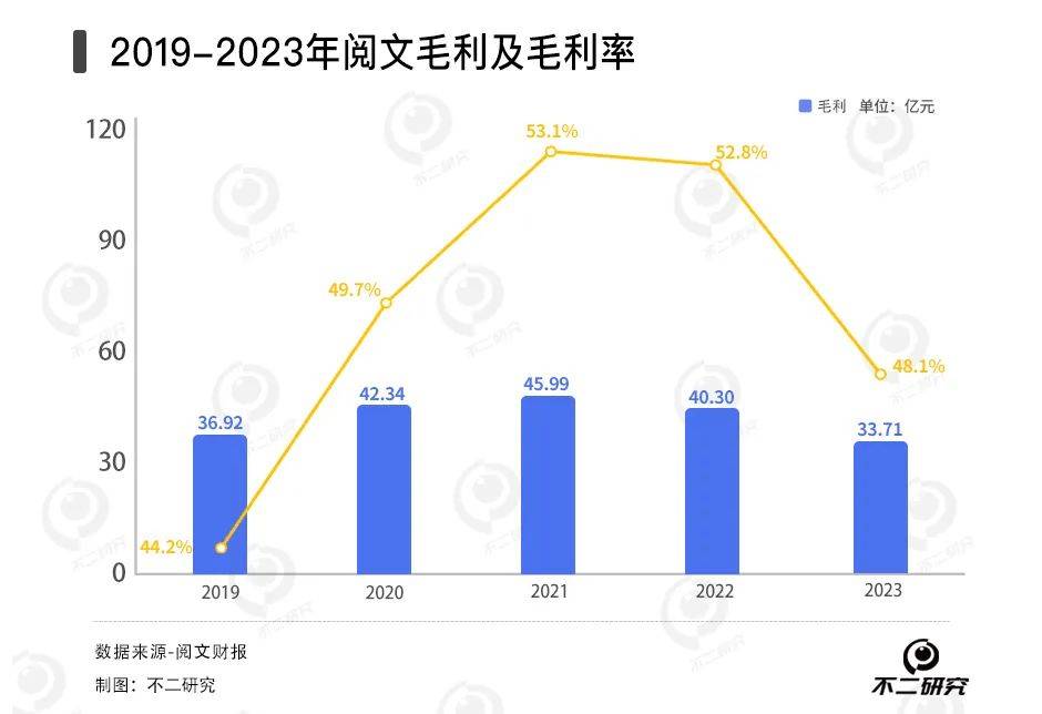 对比往年数据,2019-2023年财报显示,阅文毛利分别为36.92亿元、42.34亿元、45.99亿元、40.30亿元和33.71亿元,其中2023年同比下降16.3%;毛利率分别为44.2%、49.7%、53.1%、52.8%和48.1%,其中2023年同比下降48.1%。