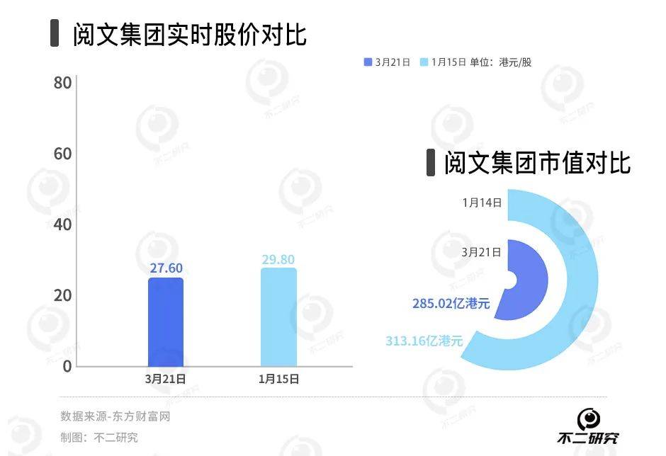 截至3月20日收盘,阅文报收27.60港元/股,对应市值282.5亿港元(约折合人民币260.06亿元);对比今年1月的市值高点313.16亿港元,其市值已经蒸发30.66亿港元(约折合人民币28.22亿元)。
