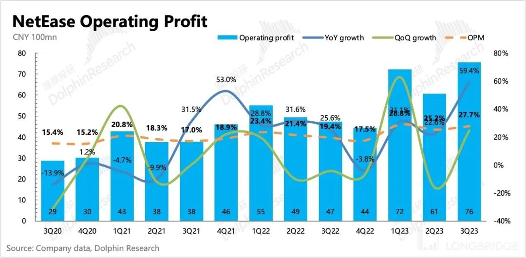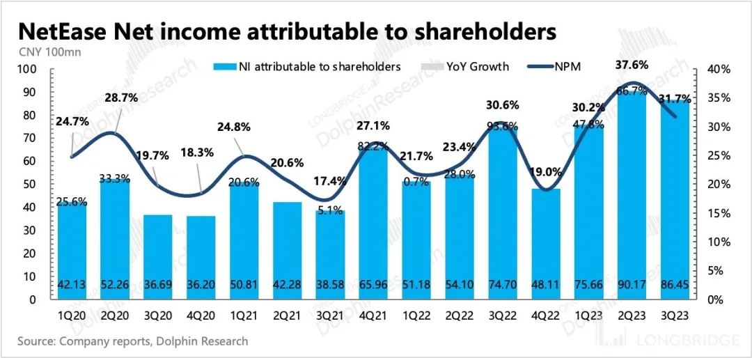 3、毛利率提升,利润再爆炸:今年以来,从《蛋仔派对》打头阵开始,网易季度利润就连续暴拉。三季度从核心经营利润上来看,更是一个同比增幅 59% 的加速增长趋势。毛利率的改善有多方面原因,剥离了低毛利率的暴雪代理游戏、云音乐高分成的直播业务调整,除此之外,游戏毛利率大幅提升的一个关键点是公司刻意降低了新游戏在安卓渠道的分发,并引导用户从官网下载后进入社群管理,这样就少了一个渠道分成的成本。