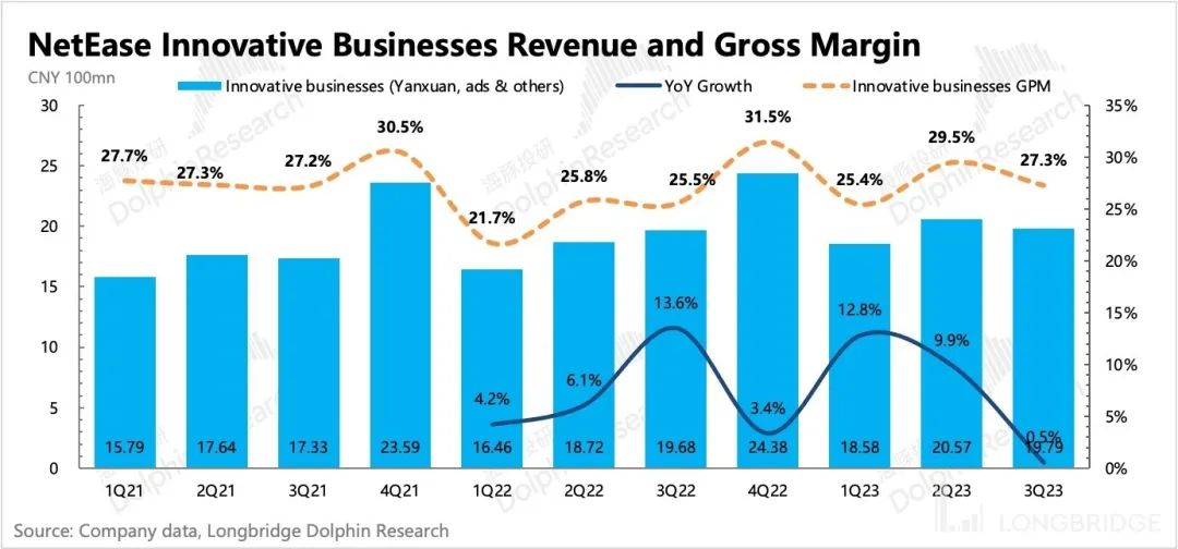 也就是严选、邮箱、新闻等产品,三季度收入 19.8 亿,同比持平,但基本没什么比较清晰的中长期趋势,短期可能主要因为严选业务,电商季节性带来的波动。三季度电商淡季,因此增幅回落。毛利率也主要因为严选的一些商品变化,以及季节性的影响下,波动下滑。