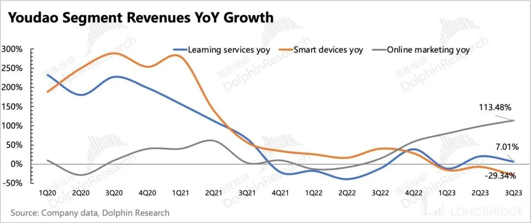 有道业务中,由于在精简渠道,提高全公司的业务 ROI,因此除了广告收入外,智能设备和线上课程表现都不咋滴。
