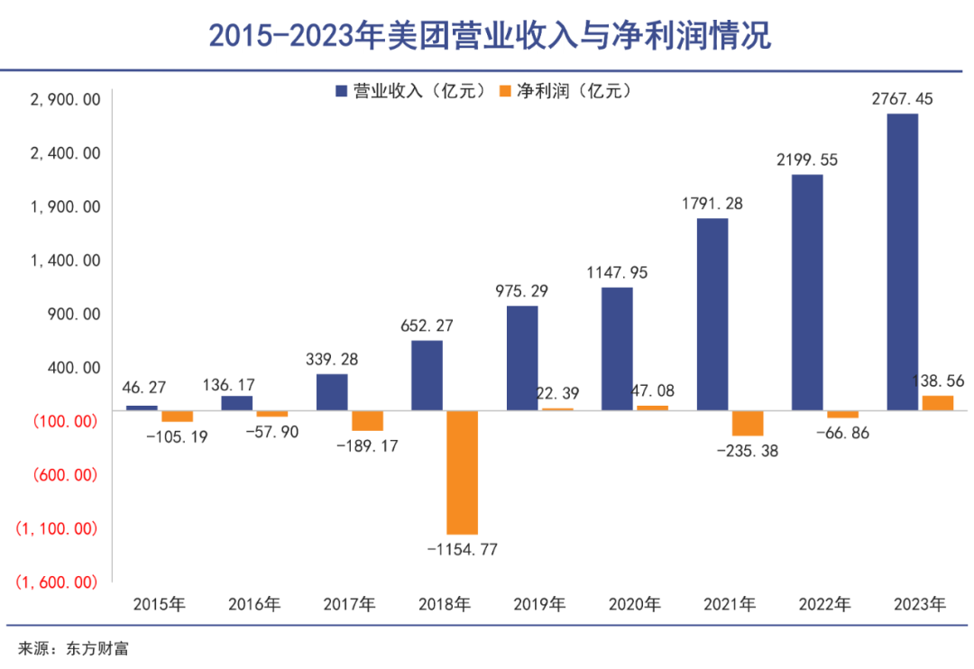 成功上岸之后,2015年至2023年美团收入从46.27亿元增至2767.45亿元,增长了近60倍。虽然规模上日益壮大,盈利方面一直不顺利。