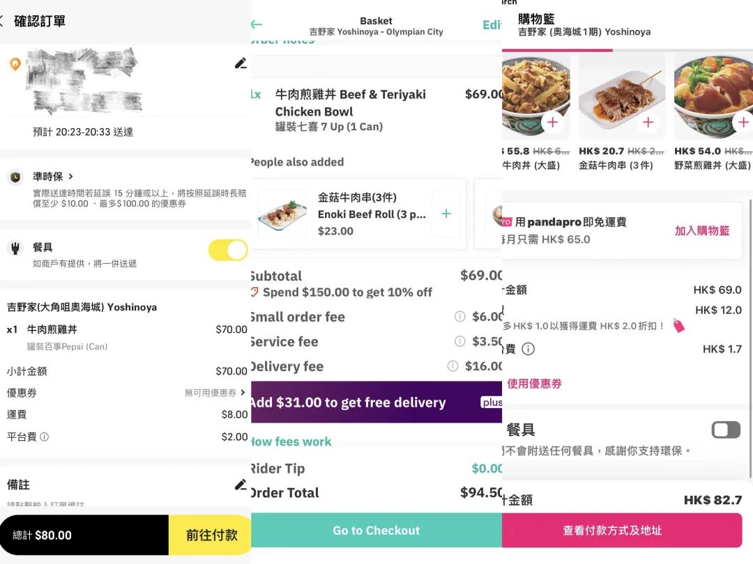 一位家住大角咀的用户琳达(化名)向光子星球演示了三个外卖平台上,下单吉野家香港大角咀奥海城店“牛肉煎鸡丼”的价格差异。其中KeeTa需要花费80元,已包括8元运费与2元平台费;最贵的是Deliveroo,在会员折扣下还是需要94.5元,包括6元的小额订单费、3.5元服务费以及16元的配送费;而Foodpanda需要82.7元,包括12元运费和1.7元平台费。