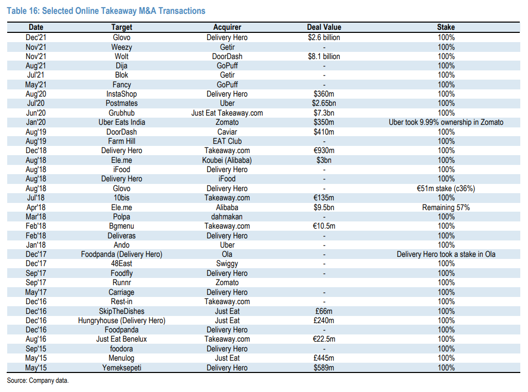 不仅美国公司跨国并购,欧洲地区的一些大型外卖企业也在一直整合和收购初创企业。例如,英国配送公司Just Eat 于2020 年初与荷兰初创公司Takeaway.com合并。