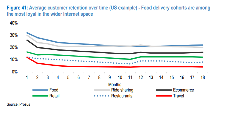 Prosus统计美国市场的互联网业务平均客户保留率的数据显示,本地生活的核心业务板块——外卖平台的用户,是互联网领域中最忠诚的消费群体之一,其忠诚度远高于电商、旅行等互联网业务。