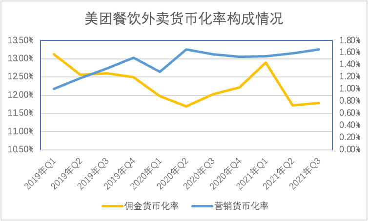 从货币化的构成角度去看,就发现了其中秘密:餐饮外卖总货币化率在过去三年时间变化不大,这也暗示餐饮业对美团的“容忍度”已经接近饱和,但出于营收质量考虑,美团外卖开始调整商业结构,降低佣金的权重,提高广告营销类收入占比,以较为“怀柔”的手段与餐饮业合作。
