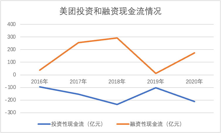 为证明融资能力对业务的重要性,我们又整理了美团融资和投资性现金流情况,见下图