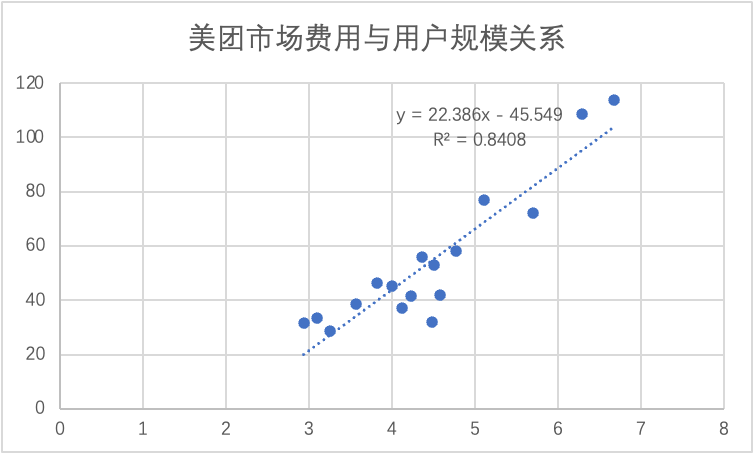 我们又将市场费用与用户规模进行拟合,两者同样呈高度相关性,中间有几个周期点状分布于拟合线下方,这也是美团利润回正的周期,彼时,用户增长是具有惯性效应的,也就是用较少的市场费用撬动更多用户,但从2021年开始,点状分布就开始向拟合线上方偏离,获客效率较之过去有所加大。