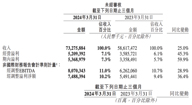 6月6日,美团披露了2024年第一季度业绩报告。财报显示,一季度实现营收733亿元,同比增长25%;净利润为53.69亿元,去年同期为33.58亿元,同比增长59.9%;调整后的净利润为74.88亿元,去年同期为54.91亿元,同比增长36.4%。