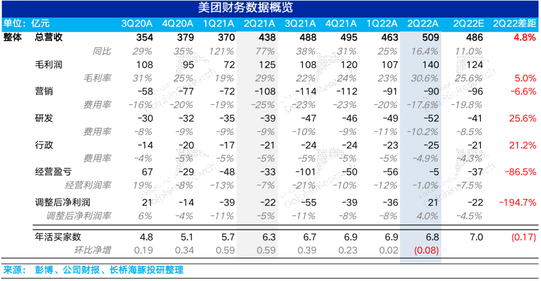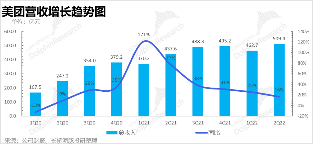 由于分部现在信息太少,海豚君接下来就重点看一下整体的业务表现:(1)二季度整体收入是509亿,同比增长了16%,显著超出市场486亿的一致预期。海豚君注意到财报前发布日期比较新的券商业绩展望判断是有提高整体的收入判断的,但基本上很少把收入拉到500亿以上的。结合新业务的市场预期情况,海豚君估计主要是核心本地商业这部分韧性比较强,尤其是就是海豚君前面重点说的即配物流比较猛。当然我估计原本的到店业务应该也没有公司原本判断的23-23%左右的负增长那么严重,疫情恢复之后,餐饮这部分恢复的还算比较快,收缩幅度可能是15%上下。