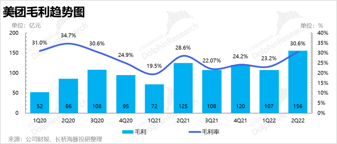 (2). 本季度毛利润156亿元,毛利率31%,高于市场预期不到26%,差距实在太大。由于美团在成本部分主要就是骑手成本,而骑手成本的缩减已经通过即配业务的毛利的大幅改善体现出来,粗估即配业务至少省出来了15亿左右的利润,是毛利率大超预期的核心原因。