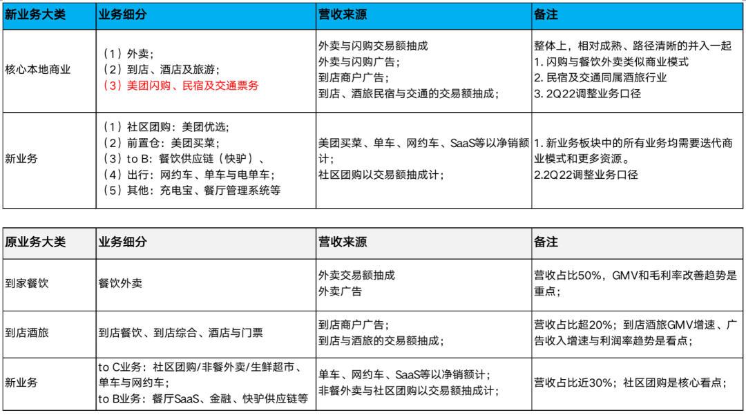 (5)这次已经是第四次调整了:而且这次基本是变脸手术的调整,把之前在本地生活领域高频(到店餐饮、餐饮外卖)打低频(酒旅票务、到店综合)、以成熟流量为基座来做新业务开拓的披露逻辑直接给废掉了。看一下新的披露口径: