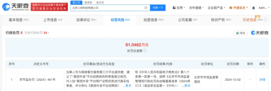 同日,美团关联公司北京三快科技有限公司因未对平台商户证照资质进行真实性审查,被北京市市场监督管理局罚款20万元,没收违法所得45.9万余元。