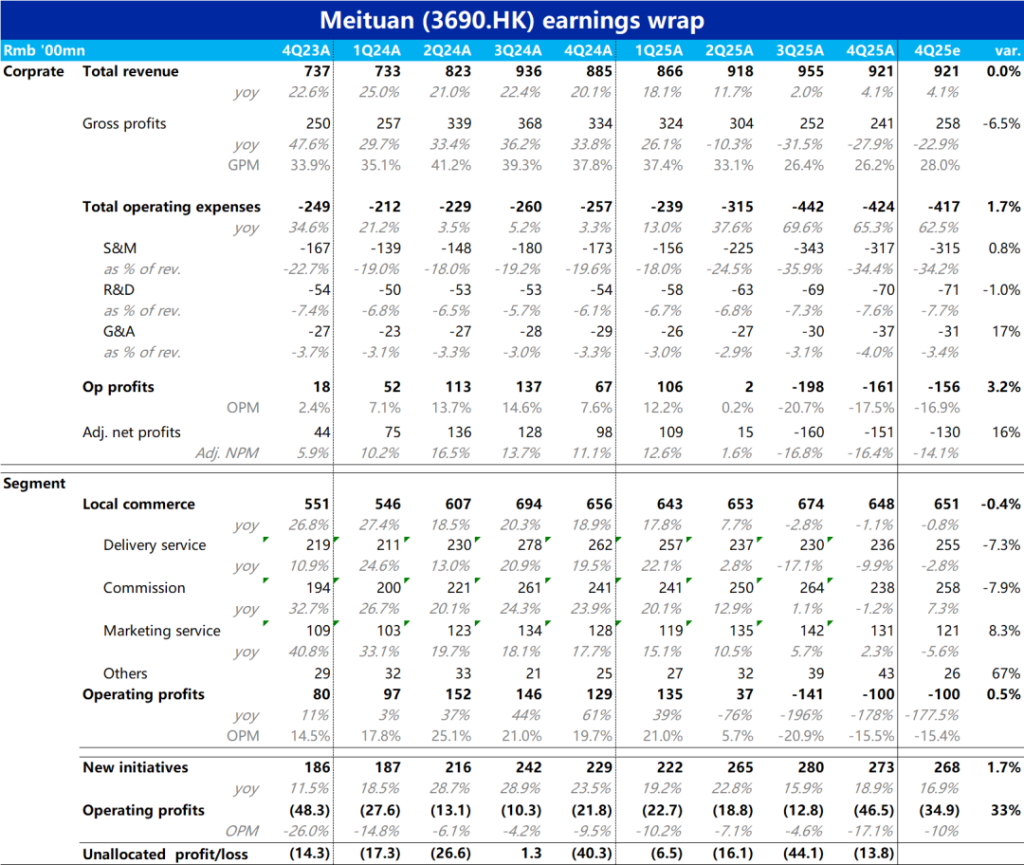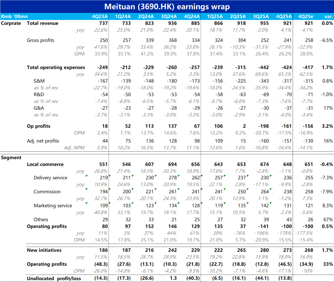 3月26日港股盘后,恒科“外卖指数”中最后一个重要玩家—美团也发布了25年最后一季度财报。由于公司此前已发布盈利预警,核心本地商业板块和集团整体亏损都是明牌,实际表现和预警基本一致。