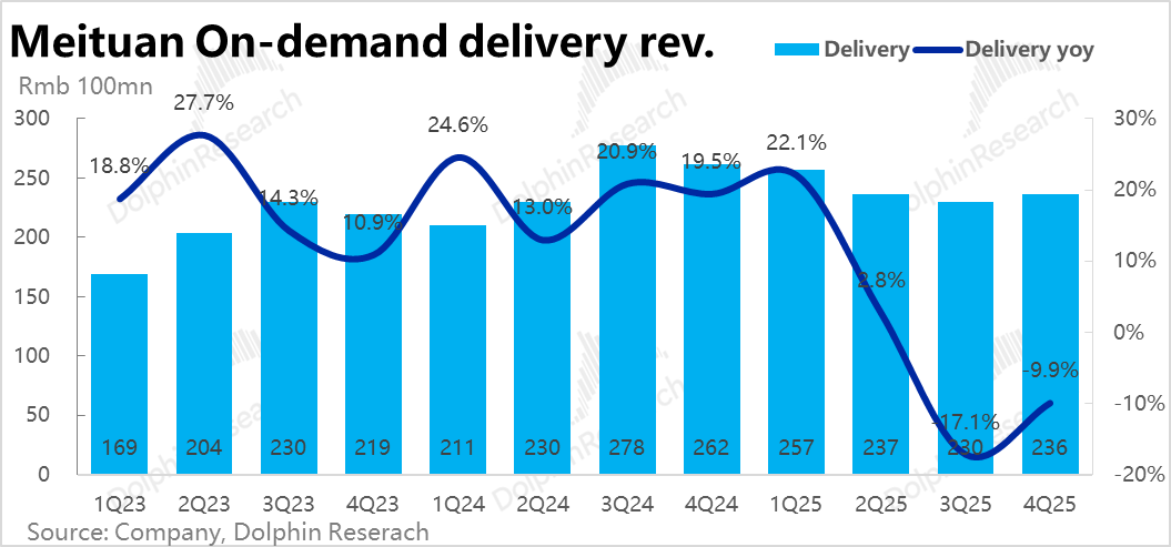 和到家业务(即外卖+闪购)强绑定的配送性收入本季同比下滑幅度从上季的17%收窄到约10%,如上季提过的,这主要是美团给骑手的补贴会记为收入减项的原因。结合市场预期的即配单量增速,隐含单笔配送收入同比减少幅度从上季的约40%收窄到了约30%(仅供参考)。