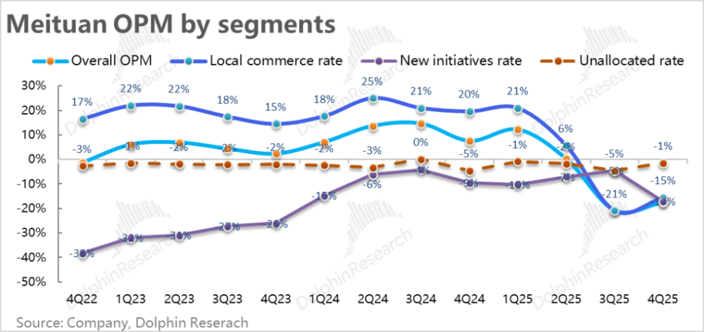 不同于配送收入增长的触底修复,本地商业的佣金和广告本季的收入增速却在继续恶化,佣金收入转为下滑1.2%,广告收入的增速也从上季的5.7%明显下降到2.3%。考虑到本季到家业务(外卖+闪购)对增速的负面拖累应当是有所缓解的,可见是美团到店业务增长进一步放缓的拖累。