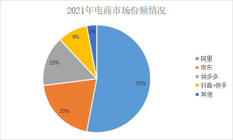 在电商领域,美团需要和阿里、京东以及拼多多、抖音电商等主流电商平台角逐,这一市场的赢面又有多大呢?有研究报告指出,2021年电商市场上,阿里一家占了一半多份额(53%),剩下的份额由京东、拼多多、快抖占据,份额分别为20%、15%、9%,这也意味着,接近9成的市场已经被“先入者”瓜分,是一个非常典型且成熟的红海市场。