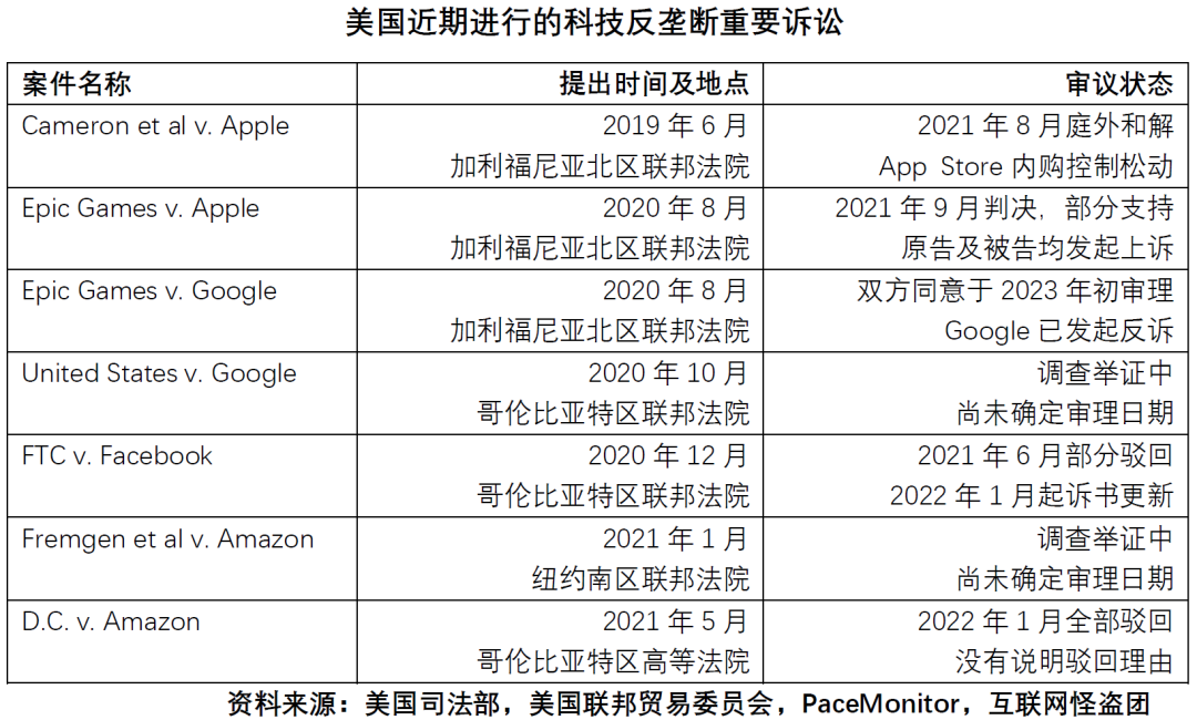 美国是适用普通法的国家,法院判决在其辖区内具备普遍的约束力(遵循先例原则),因此有“法官造法”之称。在反垄断方面,司法诉讼的影响力往往不逊于立法,而立法的实际效果还要依靠司法去实现。2019年以来,美国联邦监管者、各州以及普通当事人,对科技巨头发起了一系列的诉讼。目前看来,取得的进展并不大: