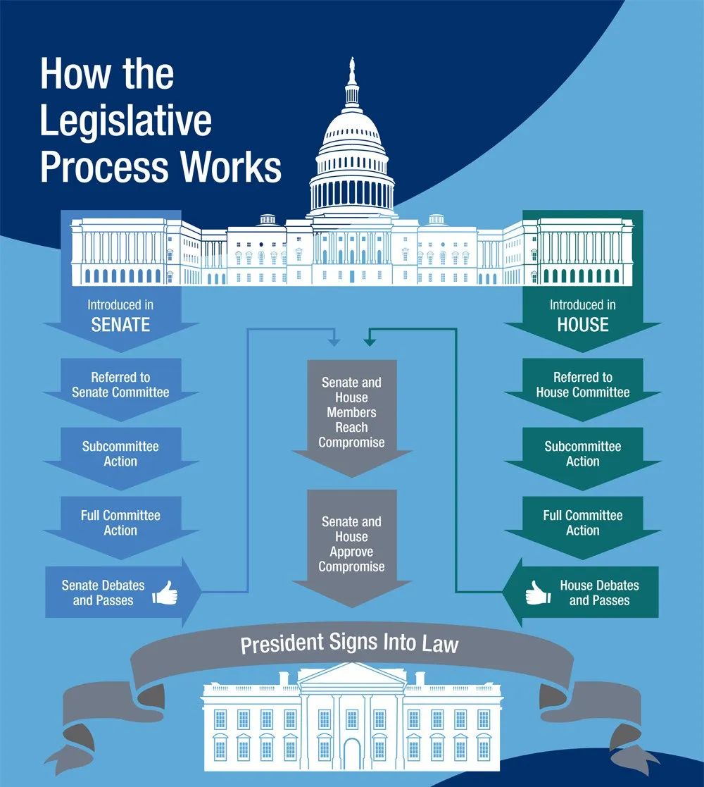 这一连串的立法,让人看着血脉贲张,实际又有多大的通过可能性呢?很遗憾,恐怕只有2-3个有希望通过。美国的联邦立法流程是先由两院的相关委员会(以及其下属的小组委员会)审议,例如上述八项法案均由两院司法委员会(Committee of Judiciary)审议;若通过,再提交全院审议;在两院均表决通过的情况下,若法案文本有冲突,还要成立两院协商小组,协商结果还要再由两院通过一次;最后提交总统,签署成法。上述任何一个环节的缺失均可能导致法案夭折。