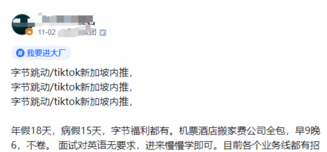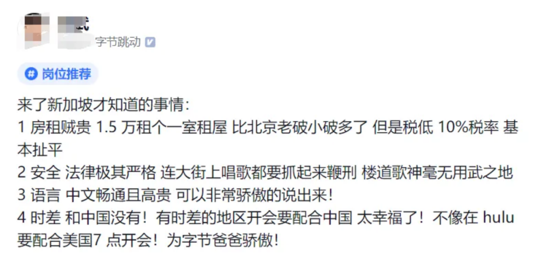 有应聘者将新加坡跟美国岗位,做了比拼,直呼幸福。“不用配合美国7点开会,为字节爸爸骄傲。”