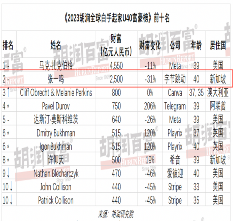 2023年4月公布的《2023胡润全球白手起家U40富豪榜》显示,40岁的张一鸣以2500亿元(折合469亿新币)的财富保持第二名,屈居扎克伯格之后。