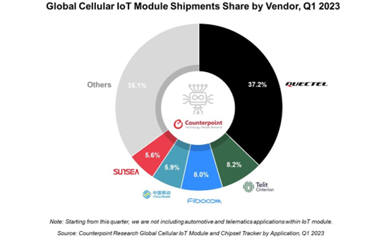 Telit Cinterion目前是海外蜂窝物联网模组厂商中最具影响力的主体,也在践行其“西方领先的物联网方案商”定位,不断强化其优势,与中国厂商开展竞争。根据市场调查机构 Counterpoint Research的数据,2023年第一季度,Telit Cinterion的出货量占比达到8.2%,超越广和通位列第二,并不断发挥其在北美和欧洲的优势地位,缩小和移远通信的差距。